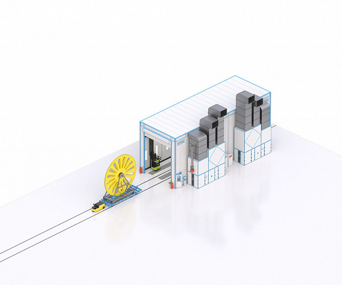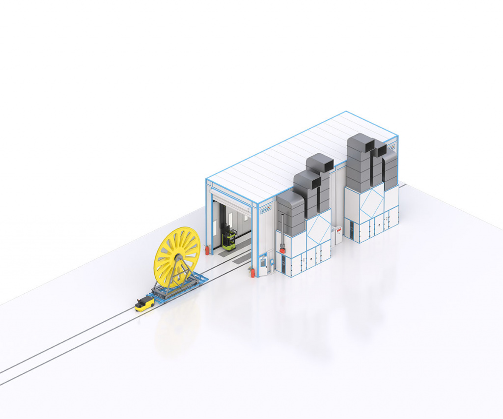 Конструкция камеры выполнена на основе металлокаркаса с порошковым покрытием и стен из сэндвич-панелей толщиной 80 мм, что обеспечивает необходимую теплоизоляцию и прочность. Внутренние размеры позволяют размещать изделия с габаритами до 6000 × 3000 × 5880 мм и массой до 7300 кг, при этом площадь окрашиваемой поверхности одного изделия достигает 141 м².